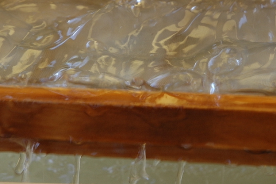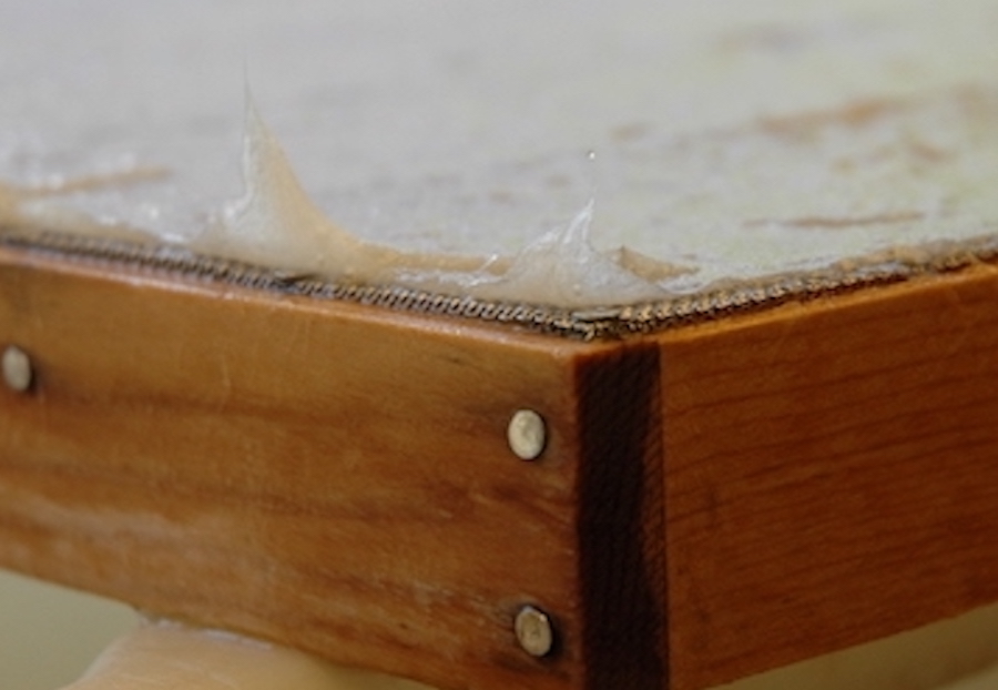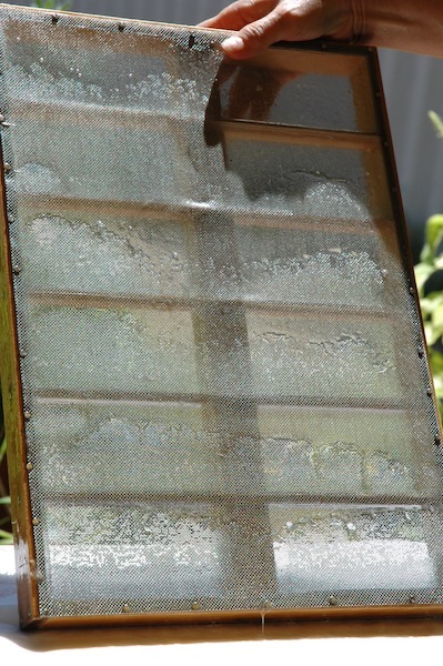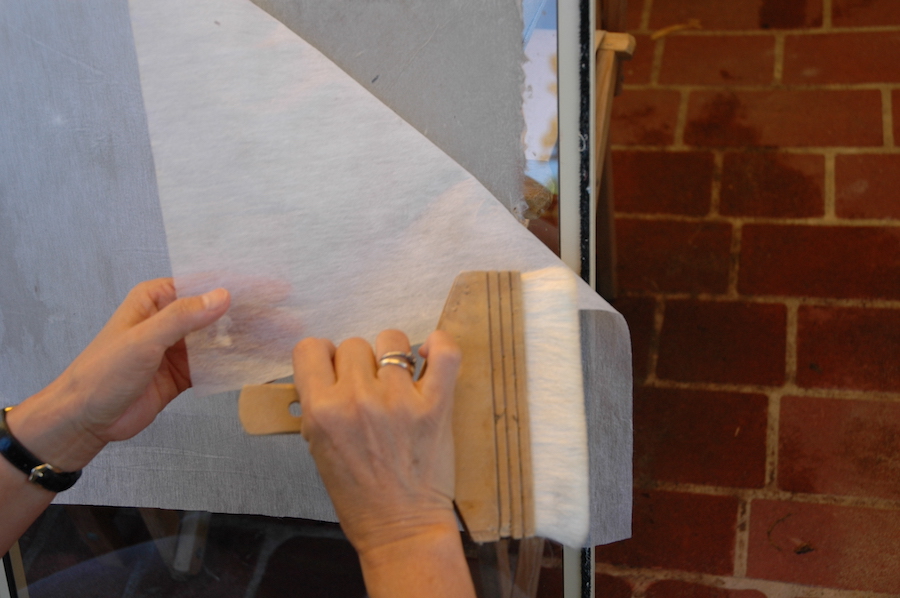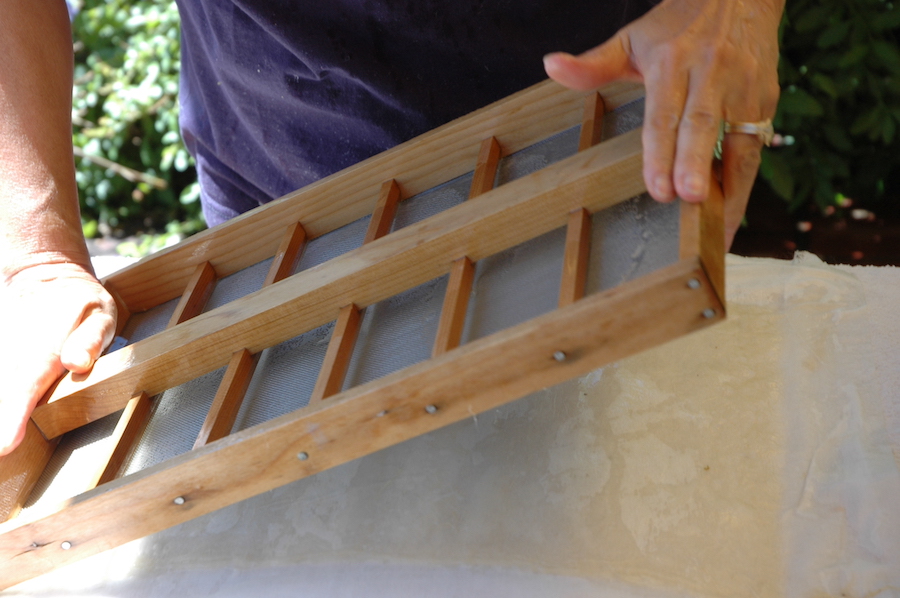 The wet paper sheets are laid on a glazed window frame
