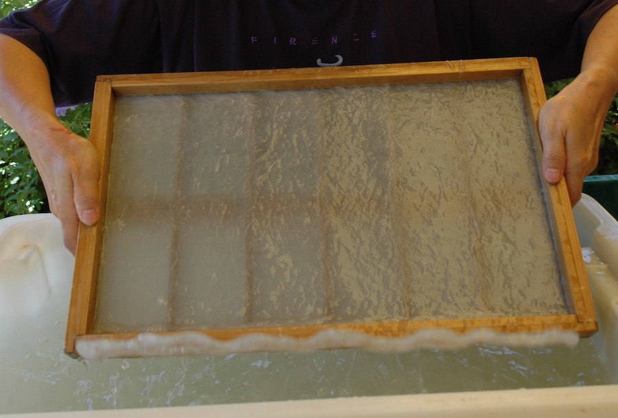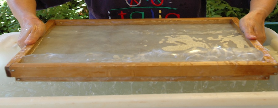 This is a screen to scoop in the pulp and water mixture